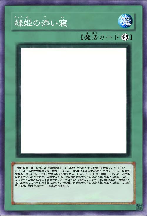 | 「蝶姫の添い寝」の(1)(2)の効果は1ターンに1度いずれか1つしか使用できない。(1):自分フィールドに表側攻撃表示の「蝶姫」モンスターが2体以上存在する場合、相手フィールドの表側攻撃表示のモンスター1体を対象にして発動できる。自分フィールドの「蝶姫」モンスターと対象の相手モンスターを表側守備表示にする。その後自分のデッキの上から2枚を墓地に送る。(2):このカードが墓地に存在する場合相手フィールドの「蝶姫カウンター」を2個取り除いて発動できる。墓地のこのカードを手札に加える。その後、自分のデッキの上から2枚を墓地に送る。この効果は墓地に送られたターンには使用できない。 | |||