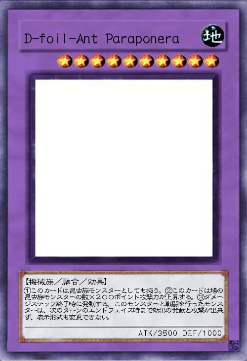 書き忘れてました、申し訳ございません。素材は「フィールド上の〈D-foil-Ant〉モンスター4体」です。Armyと同じで融合なしでリリースするだけで特殊召喚が出来る仕様になっています。