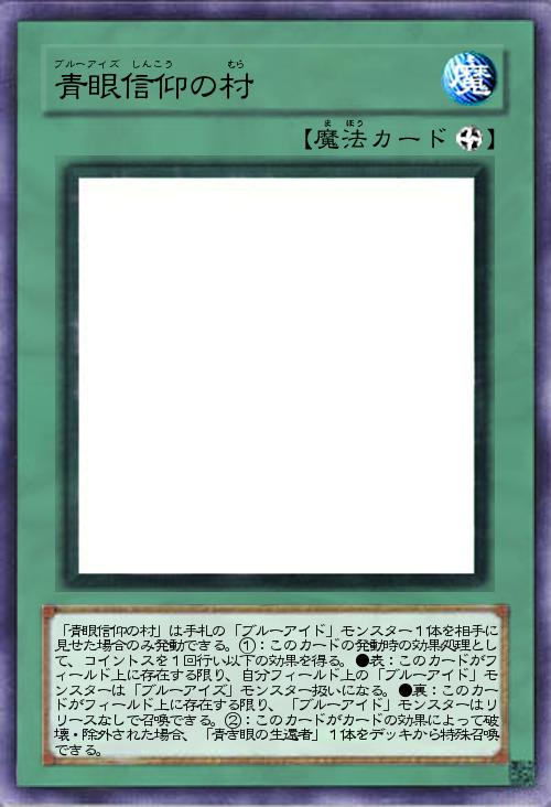 | 「青眼信仰の村」は手札の「ブルーアイド」モンスター1体を相手に見せた場合のみ発動できる。①:このカードの発動時の効果処理として、コイントスを1回行い以下の効果を得る。●表:このカードがフィールド上に存在する限り、自分フィールド上の「ブルーアイド」モンスターは「ブルーアイズ」モンスター扱いになる。●裏:このカードがフィールド上に存在する限り、「ブルーアイド」モンスターはリリースなしで召喚できる。②:このカードがカードの効果によって破壊・除外された場合、「青き眼の生還者」1体をデッキから特殊召喚できる。 | |||
