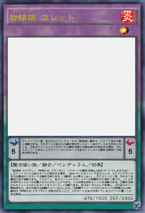 | ①1ターンに1度、自分のエクストラデッキの「珈琲娘」融合モンスター1体を対象に発動できる。そのカードに記された融合素材モンスター1組をデッキから手札に加える。②自分フィールドにこのカードの融合召喚に必要な素材が存在する場合、それらをリリースすることでPゾーンのこのカードを自分フィールドに融合召喚扱いで特殊召喚できる。 | |||