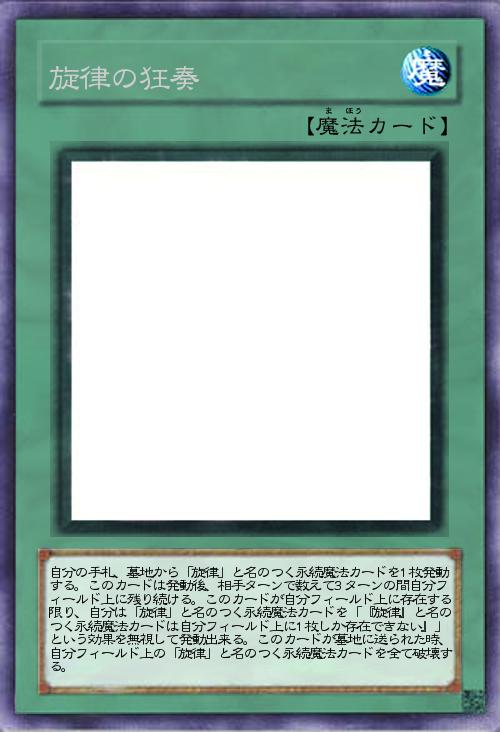 | 自分の手札、墓地から「旋律」と名のつく永続魔法カードを1枚発動する。このカードは発動後、相手ターンで数えて3ターンの間自分フィールド上に残り続ける。このカードが自分フィールド上に存在する限り、自分は「旋律」と名のつく永続魔法カードを「『旋律』と名のつく永続魔法カードは自分フィールド上に1枚しか存在できない』」という効果を無視して発動出来る。このカードが墓地に送られた時、自分フィールド上の「旋律」と名のつく永続魔法カードを全て破壊する。 | |||