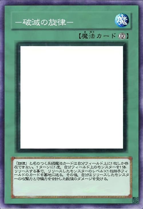 | 「旋律」と名のつく永続魔法カードは自分フィールド上に1枚しか存在できない。1ターンに1度、自分フィールド上のモンスターを1体リリースする事で、リリースしたモンスターのレベル×1枚相手フィールドのカードを墓地に送る。その後、自分はリリースしたモンスターの攻撃力と守備力を合計した数値のダメージを受ける。 | |||