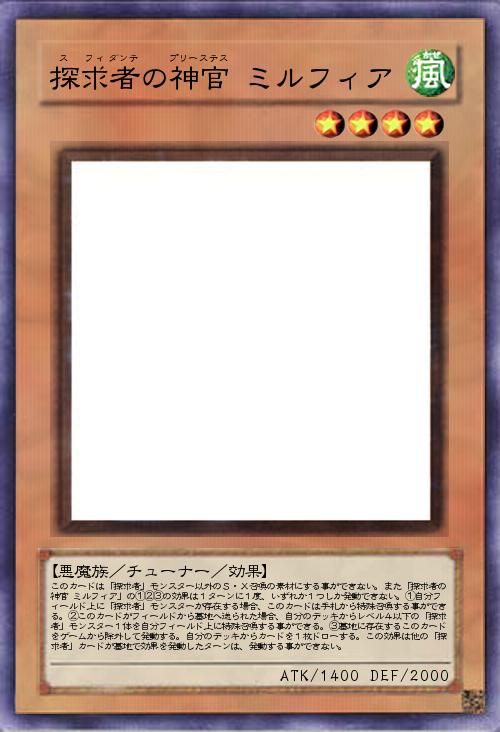 | このカードは「探求者」モンスター以外のS・X召喚の素材にする事ができない。また「探求者の神官 ミルフィア」の①②③の効果は1ターンに1度、いずれか1つしか発動できない。①自分フィールド上に「探求者」モンスターが存在する場合、このカードは手札から特殊召喚する事ができる。②このカードがフィールドから墓地へ送られた場合、自分のデッキからレベル4以下の「探求者」モンスター1体を自分フィールド上に特殊召喚する事ができる。③墓地に存在するこのカードをゲームから除外して発動する。自分のデッキからカードを1枚ドローする。この効果は他の「探求者」カードが墓地で効果を発動したターンは、発動する事ができない。 | |||