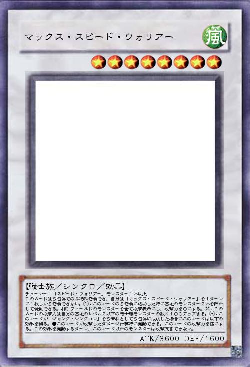 | チューナー+「スピード・ウォリアー」モンスター1体以上 このカードはS召喚でのみ特殊召喚でき、自分は「マックス・スピード・ウォリアー」を1ターンに1枚しかS召喚できない。①:このカードのS召喚に成功した時に墓地のモンスター2体を除外して発動できる。相手フィールドのモンスターを全て攻撃表示にし、攻撃力を0にする。②:このカードの攻撃力は自分の墓地のレベル2以下の戦士族モンスターの数×100アップする。③:このカードが「ジャンク・シンクロン」をS素材としてS召喚に成功した場合にこのカードは以下の効果を得る。●このカードが攻撃したダメージ計算時に発動できる。このカードの攻撃力を倍にする。この効果を発動するターン、このカード以外のモンスターは攻撃宣言できない。 | |||