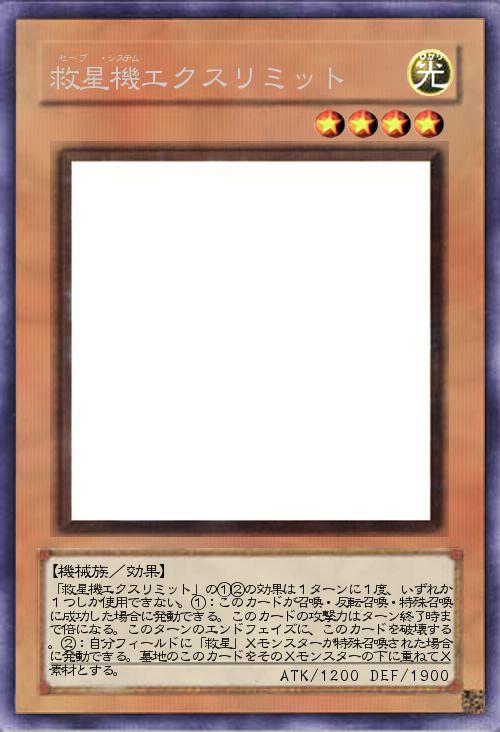 | 「救星機エクスリミット」の①②の効果は1ターンに1度、いずれか1つしか使用できない。①:このカードが召喚・反転召喚・特殊召喚に成功した場合に発動できる。このカードの攻撃力はターン終了時まで倍になる。このターンのエンドフェイズに、このカードを破壊する。②:自分フィールドに「救星」Xモンスターが特殊召喚された場合に発動できる。墓地のこのカードをそのXモンスターの下に重ねてX素材とする。 | |||