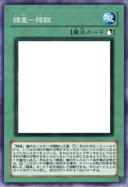 | 「肆皇」儀式モンスターの降臨に必要。①:自分の手札・フィールドから、レベルの合計が儀式召喚するモンスターのレベルと同じになるようにモンスターをリリース、またはエクストラデッキからレベルの合計が儀式召喚するモンスターのレベルと同じになるようにモンスターを墓地へ送り、手札から「肆皇」儀式モンスター1体を儀式召喚する。②:このカードが墓地に存在する場合、Pゾーンの既に効果を発動した「肆皇」カード1枚を選択して発動できる。そのカードとこのカードをデッキに戻し、自分はデッキから1枚ドローする。 | |||