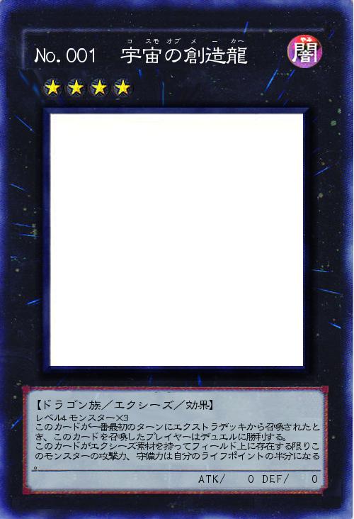 | レベル4モンスター×3 このカードが一番最初のターンにエクストラデッキから召喚されたとき、このカードを召喚したプレイヤーはデュエルに勝利する。 このカードがエクシーズ素材を持ってフィールド上に存在する限りこのモンスターの攻撃力、守備力は自分のライフポイントの半分になる。 | |||