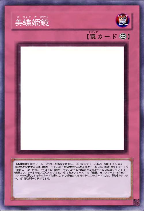 | 「美蝶姫鏡」はフィールドに1枚しか存在できない。(1):自分フィールドの「蝶姫」モンスターの効果が発動する又は「蝶姫」モンスターが破壊される度このカードの上に「蝶姫カウンター」を1個置く。(2):自分フィールドの「蝶姫」モンスターの攻撃力をこのカードの上に置いている「蝶姫カウンター」の数×200アップする。(3):自分フィールドの「蝶姫」モンスターが相手モンスターの攻撃又は相手のカード効果によって破壊される代わりにこのカードの上の「蝶姫カウンター」を1個取り除く事ができる。 | |||