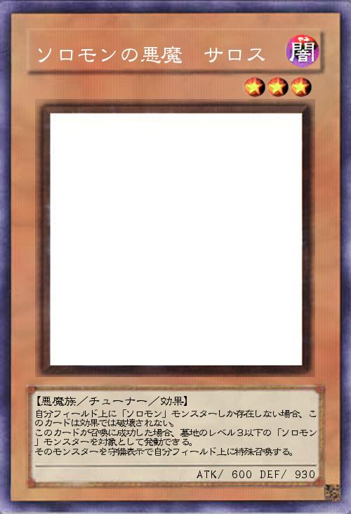 | 自分フィールド上に「ソロモン」モンスターしか存在しない場合、このカードは効果では破壊されない。 このカードが召喚に成功した場合、墓地のレベル3以下の「ソロモン」モンスターを対象として発動できる。 そのモンスターを守備表示で自分フィールド上に特殊召喚する。 | |||