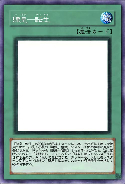 | 「肆皇―転生」の①②の効果は1ターンに1度、それぞれ1度しか使用できない。①:手札の「肆皇」儀式モンスター1体を相手に見せて発動できる。デッキから「肆皇―降臨」1枚を手札に加える。②:墓地のこのカードを除外し、フィールドの「肆皇」儀式モンスター1体を持ち主のデッキに戻して発動できる。デッキから、戻したモンスターの同名カード以外の「肆皇」儀式モンスターを召喚条件を無視して特殊召喚する。 | |||