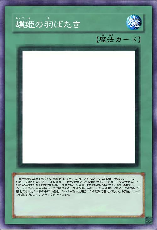 | 「蝶姫の羽ばたき」の(1)(2)の効果は1ターンに1度,いずれか1つしか使用できない。(1):このカード以外の自分フィールドのカード1枚を対象にして発動できる。そのカードを破壊する。その後自分の手札から攻撃力1000以下の昆虫族モンスター1体を特殊召喚できる。(2):墓地のこのカードをゲームから除外して発動できる。自分のデッキの上から3枚を墓地に送る。この効果で墓地に送ったカードの中に「蝶姫」カードがあった場合、この効果で墓地に送った「蝶姫」カードの枚数だけ自分のデッキからドローできる。 | |||