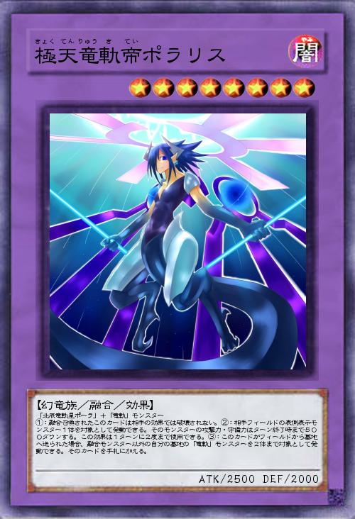 | 「北辰竜軌星ポーラ」+「竜軌」モンスター ①:融合召喚されたこのカードは相手の効果では破壊されない。②:相手フィールドの表側表示モンスター1体を対象として発動できる。そのモンスターの攻撃力・守備力はターン終了時まで500ダウンする。この効果は1ターンに2度まで使用できる。③:このカードがフィールドから墓地へ送られた場合、融合モンスター以外の自分の墓地の「竜軌」モンスターを2体まで対象として発動できる。そのカードを手札に加える。 | |||