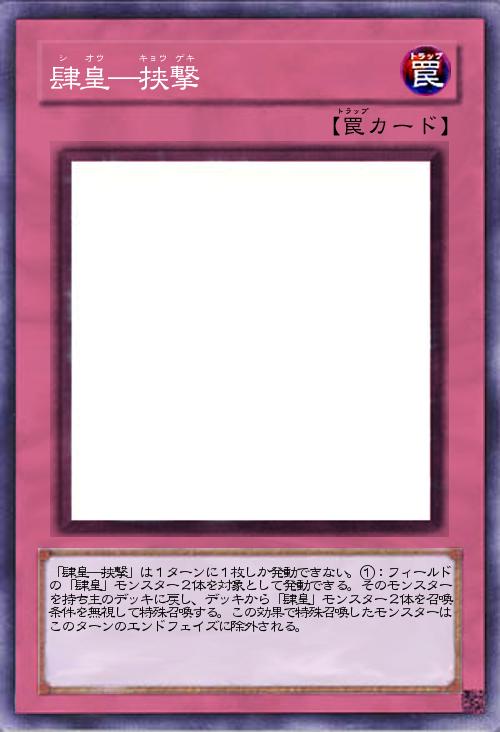| 「肆皇―挟撃」は1ターンに1枚しか発動できない。①:フィールドの「肆皇」モンスター2体を対象として発動できる。そのモンスターを持ち主のデッキに戻し、デッキから「肆皇」モンスター2体を召喚条件を無視して特殊召喚する。この効果で特殊召喚したモンスターはこのターンのエンドフェイズに除外される。 | |||