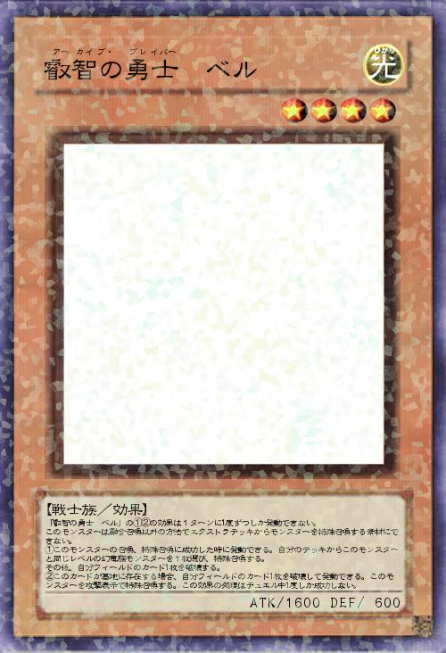 | 「叡智の勇士 ベル」の①②の効果は1ターンに1度ずつしか発動できない。 このモンスターは融合召喚以外の方法でエクストラデッキからモンスターを特殊召喚する素材にできない。 ①このモンスターの召喚、特殊召喚に成功した時に発動できる。自分のデッキからこのモンスターと同じレベルの幻竜族モンスターを1枚選び、特殊召喚する。 その後、自分フィールドのカード1枚を破壊する。 ②このカードが墓地に存在する場合、自分フィールドのカード1枚を破壊して発動できる。このモンスターを攻撃表示で特殊召喚する。この効果の処理はデュエル中1度しか成功しない。 | |||
