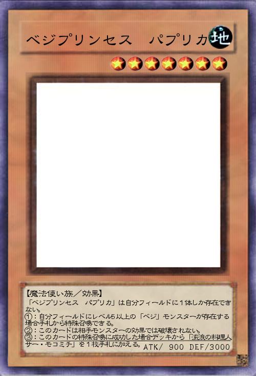 | 「ベジプリンセス パプリカ」は自分フィールドに1体しか存在できない。 ①:自分フィールドにレベル5以上の「ベジ」モンスターが存在する場合手札から特殊召喚できる。 ②:このカードは相手モンスターの効果では破壊されない。 ③:このカードの特殊召喚に成功した場合デッキから「流浪の料理人サー・モコミチ」を1枚手札に加える。 | |||