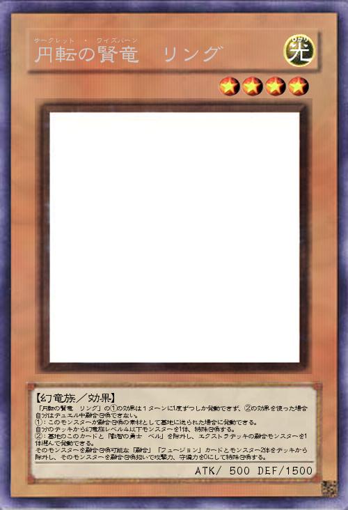 | 「円転の賢竜 リング」の①の効果は1ターンに1度ずつしか発動できず、②の効果を使った場合自分はデュエル中融合召喚できない。 ①:このモンスターが融合召喚の素材として墓地に送られた場合に発動できる。 自分のデッキから幻竜族レベル4以下モンスターを1体、特殊召喚する。 ②:墓地のこのカードと「叡智の勇士 ベル」を除外し、エクストラデッキの融合モンスターを1体選んで発動できる。 そのモンスターを融合召喚可能な「融合」「フュージョン」カードとモンスター2体をデッキから除外し、そのモンスターを融合召喚扱いで攻撃力、守備力を0にして特殊召喚する。 | |||