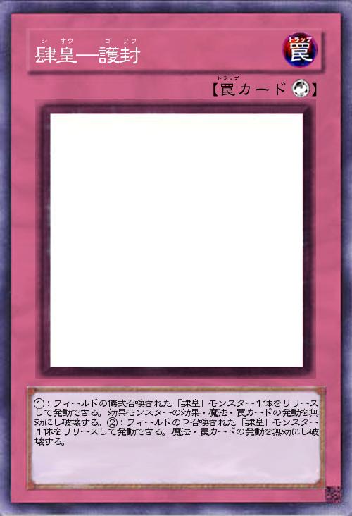 | ①:フィールドの儀式召喚された「肆皇」モンスター1体をリリースして発動できる。効果モンスターの効果・魔法・罠カードの発動を無効にし破壊する。②:フィールドのP召喚された「肆皇」モンスター1体をリリースして発動できる。魔法・罠カードの発動を無効にし破壊する。 | |||