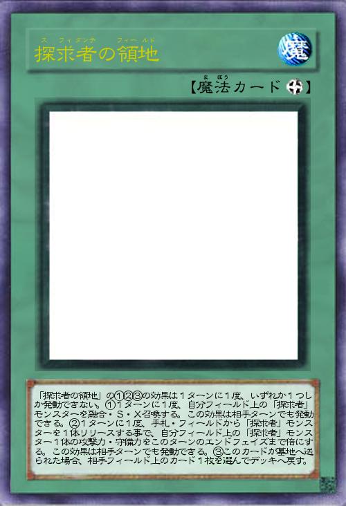 | 「探求者の領地」の①②③の効果は1ターンに1度、いずれか1つしか発動できない。①1ターンに1度、自分フィールド上の「探求者」モンスターを融合・S・X召喚する。この効果は相手ターンでも発動できる。②1ターンに1度、手札・フィールドから「探求者」モンスターを1体リリースする事で、自分フィールド上の「探求者」モンスター1体の攻撃力・守備力をこのターンのエンドフェイズまで倍にする。この効果は相手ターンでも発動できる。③このカードが墓地へ送られた場合、相手フィールド上のカード1枚を選んでデッキへ戻す。 | |||