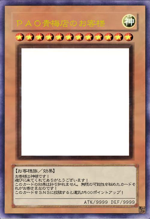 | お客様は神様です! 遊びに来てくれてありがとうございます! このカードの効果は計り知れません。無限の可能性を秘めたカードそれがお客さまなのです! このカードをSNSに投稿すると運気が500ポイントアップ! | |||