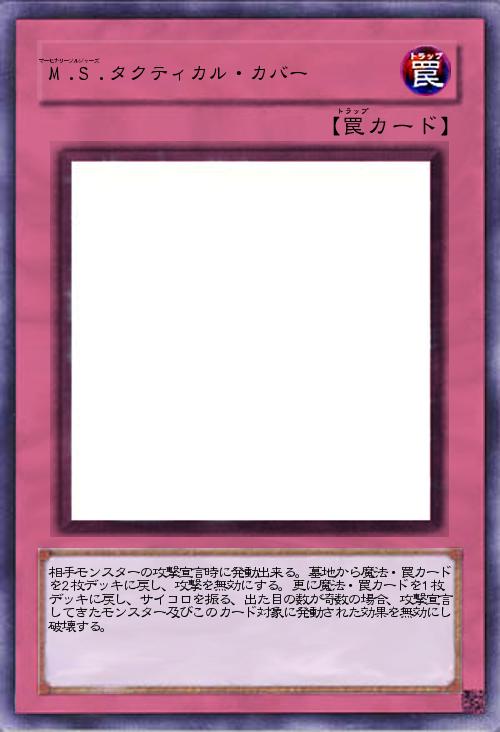 | 相手モンスターの攻撃宣言時に発動出来る。墓地から魔法・罠カードを2枚デッキに戻し、攻撃を無効にする。更に魔法・罠カードを1枚デッキに戻し、サイコロを振る、出た目の数が奇数の場合、攻撃宣言してきたモンスター及びこのカード対象に発動された効果を無効にし破壊する。 | |||