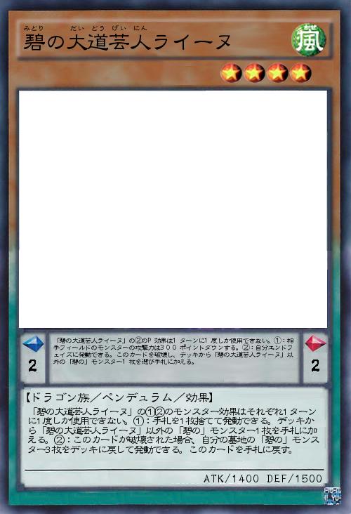 | 「碧の大道芸人ライーヌ」の①②のモンスター効果はそれぞれ1ターンに1度しか使用できない。①:手札を1枚捨てて発動できる。デッキから「碧の大道芸人ライーヌ」以外の「碧の」モンスター1枚を手札に加える。②:このカードが破壊された場合、自分の墓地の「碧の」モンスター3枚をデッキに戻して発動できる。このカードを手札に戻す。 | |||