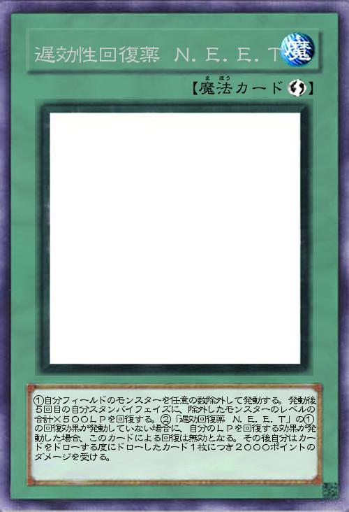 | ①自分フィールドのモンスターを任意の数除外して発動する。発動後5回目の自分スタンバイフェイズに、除外したモンスターのレベルの合計×500LPを回復する。②「遅効回復薬 N.E.E.T」の①の回復効果が発動していない場合に、自分のLPを回復する効果が発動した場合、このカードによる回復は無効となる。その後自分はカードをドローする度にドローしたカード1枚につき2000ポイントのダメージを受ける。 | |||