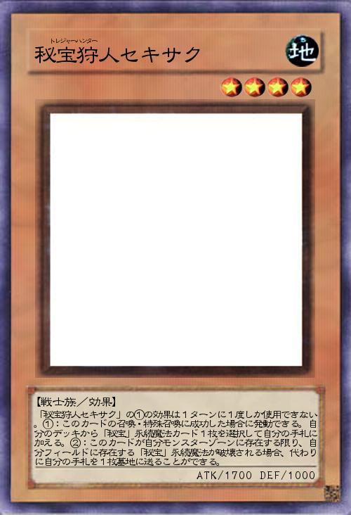 | 「秘宝狩人セキサク」の①の効果は1ターンに1度しか使用できない。①:このカードの召喚・特殊召喚に成功した場合に発動できる。自分のデッキから「秘宝」永続魔法カード1枚を選択して自分の手札に加える。②:このカードが自分モンスターゾーンに存在する限り、自分フィールドに存在する「秘宝」永続魔法が破壊される場合、代わりに自分の手札を1枚墓地に送ることができる。 | |||