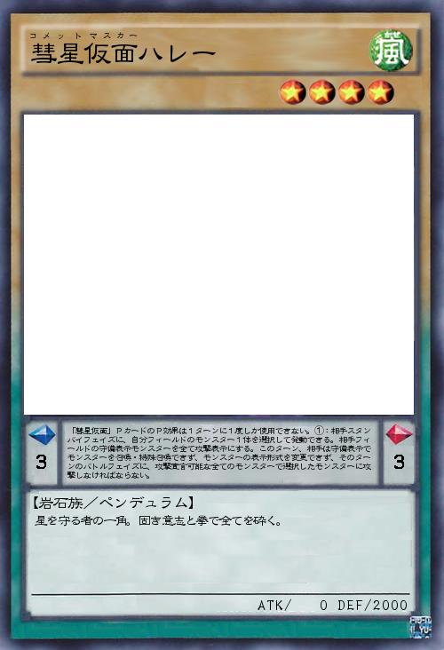 | 「彗星仮面」PカードのP効果は1ターンに1度しか使用できない。①:相手スタンバイフェイズに、自分フィールドのモンスター1体を選択して発動できる。相手フィールドの守備表示モンスターを全て攻撃表示にする。このターン、相手は守備表示でモンスターを召喚・特殊召喚できず、モンスターの表示形式を変更できず、そのターンのバトルフェイズに、攻撃宣言可能な全てのモンスターで選択したモンスターに攻撃しなければならない。 | |||