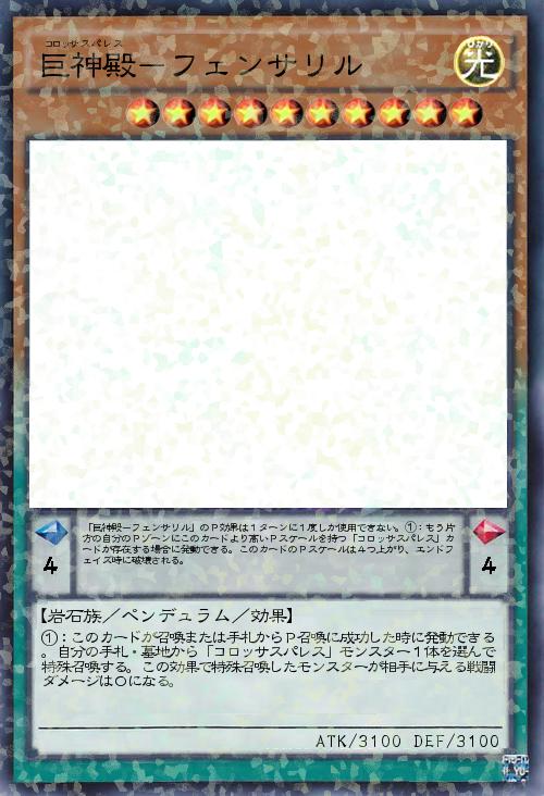 | 「巨神殿-フェンサリル」のP効果は1ターンに1度しか使用できない。①:もう片方の自分のPゾーンにこのカードより高いPスケールを持つ「コロッサスパレス」カードが存在する場合に発動できる。このカードのPスケールは4つ上がり、エンドフェイズ時に破壊される。 | |||