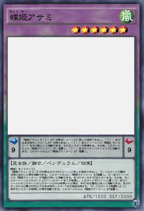 | 蝶姫」モンスター×2 「蝶姫アサミ」の(2)(3)の効果はそれぞれ1ターンに1度しか使用できない。(1):このカードが融合召喚に成功した場合発動できる。このカードの上に「蝶姫カウンター」を3個置く。(2):自分フィールドの「蝶姫カウンター」を3個取り除いて発動できる。自分のデッキから2枚ドローする。その後、モンスターゾーンのこのカードとPゾーンのカード全てを破壊し、このカードをPゾーンに置く(3):自分フィールドのこのカードがこのカード以外の破壊された場合、手札1枚を墓地に送って発動できる。自分のデッキから攻撃力1000以下の昆虫族モンスター1体を特殊召喚する。(4):このカードが戦闘によって相手モンスターを破壊した場合発動できる。このカードの上に「蝶姫カウンター」を1個置く。 | |||