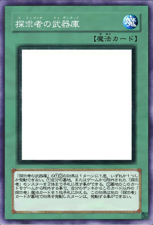 | 「探求者の武器庫」の①②の効果は1ターンに1度、いずれか1つしか発動できない。①自分の墓地、またはゲームから除外された「探求者」モンスターを2体まで手札に戻す事ができる。②墓地のこのカードをゲームから除外する事で、自分のデッキからこのカード以外の「探求者」魔法カードを1枚手札に加える。この効果は他の「探求者」カードが墓地で効果を発動したターンは、発動する事ができない。 | |||