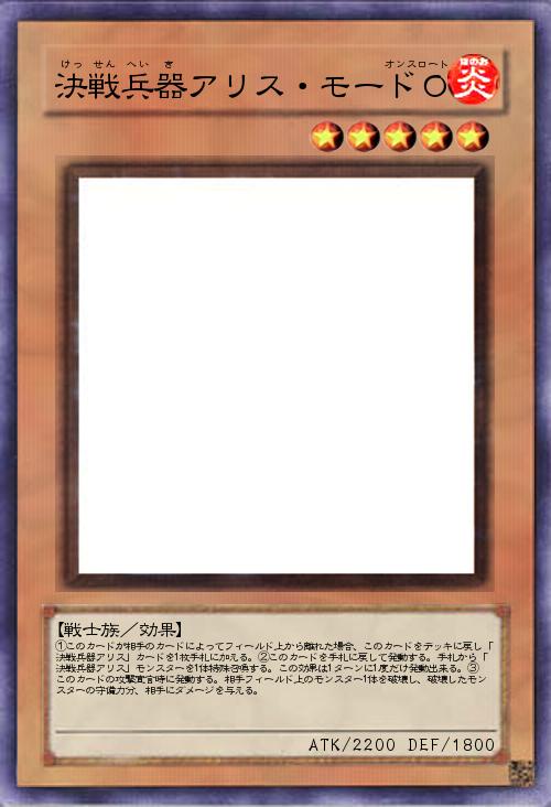 | ①このカードが相手のカードによってフィールド上から離れた場合、このカードをデッキに戻し「決戦兵器アリス」カードを1枚手札に加える。②このカードを手札に戻して発動する。手札から「決戦兵器アリス」モンスターを1体特殊召喚する。この効果は1ターンに1度だけ発動出来る。③このカードの攻撃宣言時に発動する。相手フィールド上のモンスター1体を破壊し、破壊したモンスターの守備力分、相手にダメージを与える。 | |||