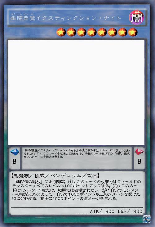 | 「幽閉業魔イクスティンクション・ナイト」の①のP効果は1ターンに1度しか発動できない。①:このカードを破壊して発動する。手札のレベル8以下の「幽閉」儀式モンスター1体を儀式召喚する。 | |||