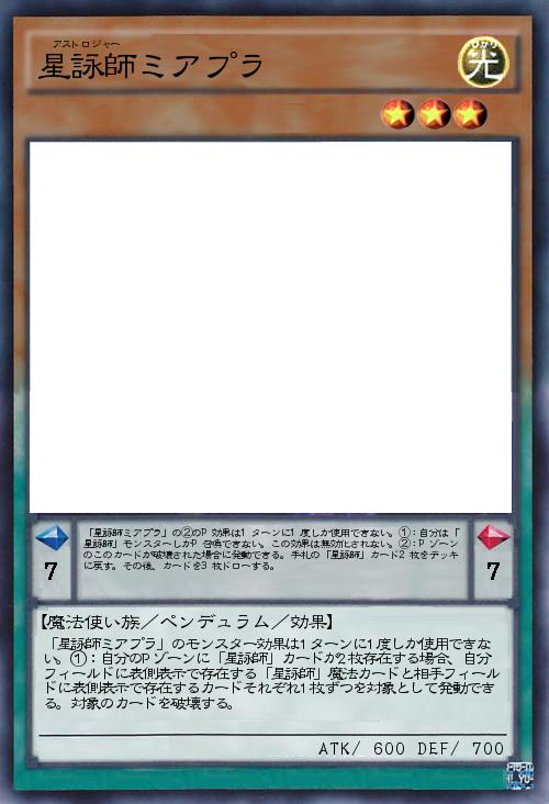 | 「星詠師ミアプラ」の②のP効果は1ターンに1度しか使用できない。①:自分は「星詠師」モンスターしかP召喚できない。この効果は無効化されない。②:Pゾーンのこのカードが破壊された場合に発動できる。手札の「星詠師」カード2枚をデッキに戻す。その後、カードを3枚ドローする。 | |||