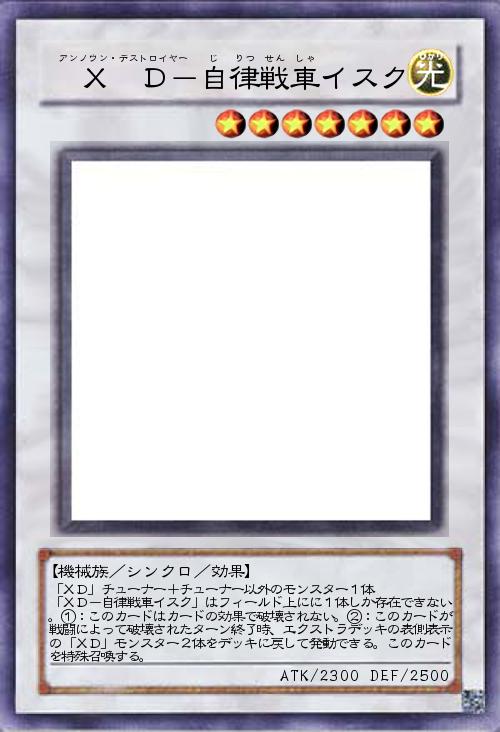 | 「XD」チューナー+チューナー以外のモンスター1体 「XD-自律戦車イスク」はフィールド上にに1体しか存在できない。①:このカードはカードの効果で破壊されない。②:このカードが戦闘によって破壊されたターン終了時、エクストラデッキの表側表示の「XD」モンスター2体をデッキに戻して発動できる。このカードを特殊召喚する。 | |||