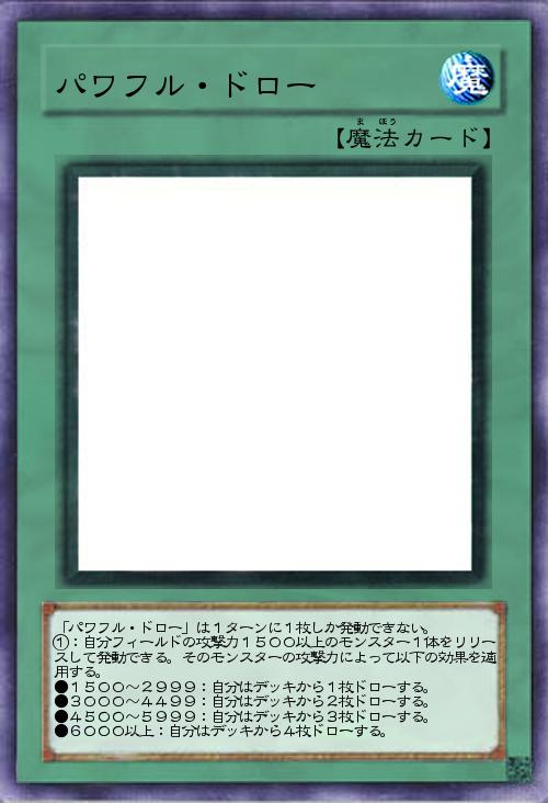 | 「パワフル・ドロー」は1ターンに1枚しか発動できない。 ①:自分フィールドの攻撃力1500以上のモンスター1体をリリースして発動できる。そのモンスターの攻撃力によって以下の効果を適用する。 ●1500~2999:自分はデッキから1枚ドローする。 ●3000~4499:自分はデッキから2枚ドローする。 ●4500~5999:自分はデッキから3枚ドローする。 ●6000以上:自分はデッキから4枚ドローする。 | |||
