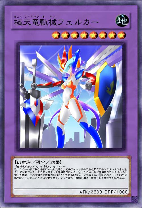 融合召喚時、相手の攻撃表示モンスターを守備表示に変更、守備貫通、戦闘ダメージを与えた時にデッキから「竜軌」魔法罠をサーチ。という効果を持っています。テキストの余り空間がもどかしい。