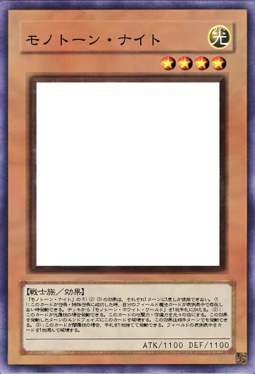 | 「モノトーン・ナイト」の(1)(2)(3)の効果は、それぞれ1ターンに1度しか使用できない。(1):このカードが召喚・特殊召喚に成功した時、自分のフィールド魔法カードが表側表示で存在しない時発動できる。デッキから「モノトーン・ホワイト・ワールド」を1枚手札に加える。(2):このカードが光属性の場合発動できる。このカードの攻撃力・守備力を元々の倍にする。この効果を発動したターンのエンドフェイズにこのカードを破壊する。この効果は相手ターンでも発動できる。(3):このカードが闇属性の場合、手札を1枚捨てて発動できる。フィールドの表側表示をカードを1枚選んで破壊する。 | |||