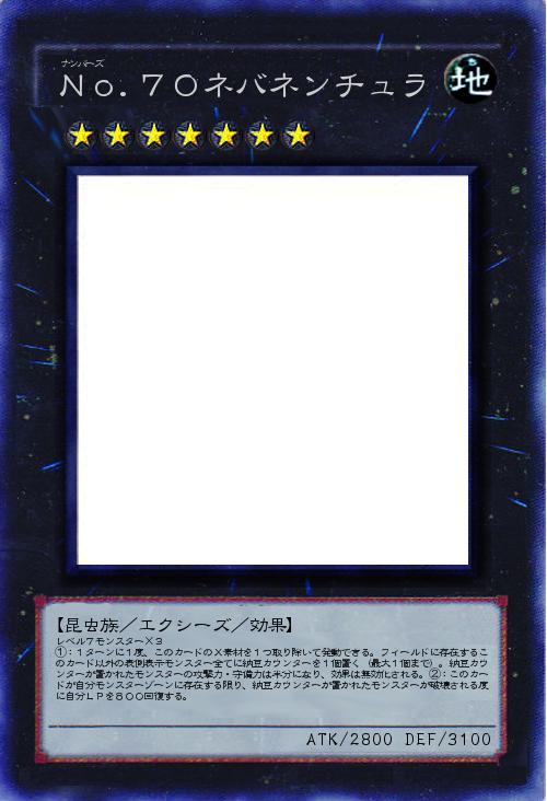 | レベル7モンスター×3 ①:1ターンに1度、このカードのX素材を1つ取り除いて発動できる。フィールドに存在するこのカード以外の表側表示モンスター全てに納豆カウンターを1個置く(最大1個まで)。納豆カウンターが置かれたモンスターの攻撃力・守備力は半分になり、効果は無効化される。②:このカードが自分モンスターゾーンに存在する限り、納豆カウンターが置かれたモンスターが破壊される度に自分LPを800回復する。 | |||