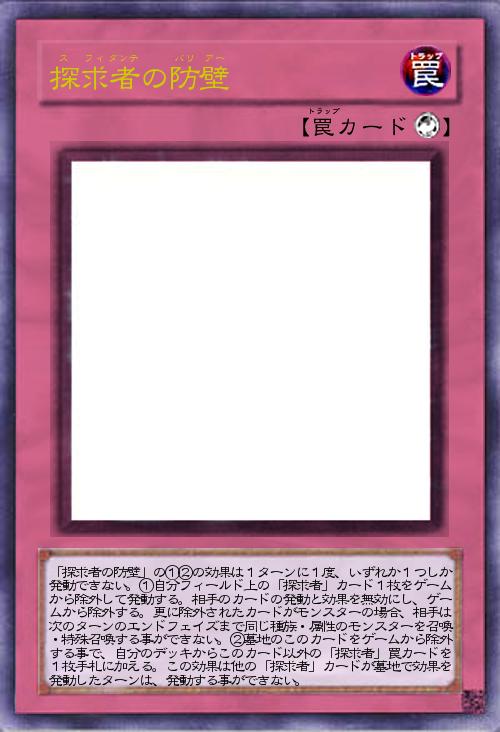 | 「探求者の防壁」の①②の効果は1ターンに1度、いずれか1つしか発動できない。①自分フィールド上の「探求者」カード1枚をゲームから除外して発動する。相手のカードの発動と効果を無効にし、ゲームから除外する。更に除外されたカードがモンスターの場合、相手は次のターンのエンドフェイズまで同じ種族・属性のモンスターを召喚・特殊召喚する事ができない。②墓地のこのカードをゲームから除外する事で、自分のデッキからこのカード以外の「探求者」罠カードを1枚手札に加える。この効果は他の「探求者」カードが墓地で効果を発動したターンは、発動する事ができない。 | |||
