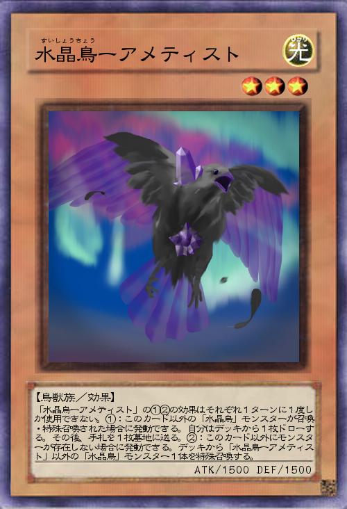 | 「水晶鳥ーアメティスト」の①②の効果はそれぞれ1ターンに1度しか使用できない。①:このカード以外の「水晶鳥」モンスターが召喚・特殊召喚された場合に発動できる。自分はデッキから1枚ドローする。その後、手札を1枚墓地に送る。②:このカード以外にモンスターが存在しない場合に発動できる。デッキから「水晶鳥ーアメティスト」以外の「水晶鳥」モンスター1体を特殊召喚する。 | |||