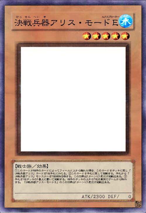 | ①このカードが相手のカードによってフィールド上から離れた場合、このカードをデッキに戻し「決戦兵器アリス」カードを1枚手札に加える。②このカードを手札に戻して発動する。手札から「決戦兵器アリス」モンスターを1体特殊召喚する。この効果は1ターンに1度だけ発動出来る。③手札を1枚デッキの1番上に置いて発動する。相手のデッキの上から7枚を裏側でゲームから除外する。「決戦兵器アリス・モードE」のこの効果は1ターンに1度だけ発動出来る。 | |||