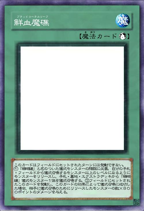 | このカードはフィールドにセットされたターンには発動できない。 ①「珊瑚嬢」と名のついた儀式モンスターの降臨に必要。自分の手札・フィールドから儀式召喚するモンスター以上のレベルになるようにモンスターをリリースし、手札・墓地・エクストラデッキから「珊瑚嬢」儀式モンスター1体を儀式召喚する。②フィールドにセットされたこのカードを発動し、このカードの効果によって儀式召喚に成功した場合、相手に儀式召喚のためにリリースしたモンスターの数×800ポイントのダメージを与える。 | |||