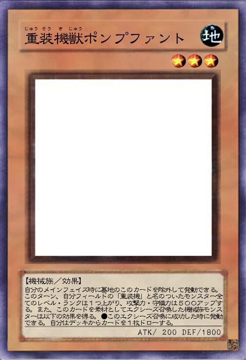 | 自分のメインフェイズ時に墓地のこのカードを除外して発動できる。このターン、自分フィールドの「重装機」と名のついたモンスター全てのレベル・ランクは1つ上がり、攻撃力・守備力は500アップする。また、このカードを素材としてエクシーズ召喚した機械族モンスターは以下の効果を得る。●このエクシーズ召喚に成功した時に発動できる。自分はデッキからカードを1枚ドローする。 | |||