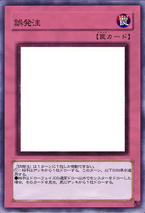 | 「誤発注」は1ターンに1枚しか発動できない。 ①:相手はデッキから1枚ドローする。このターン、以下の効果を適用する。 ●相手はドローフェイズの通常ドロー以外でモンスターをドローした場合、そのカードを見せ、更にデッキから1枚ドローする。 | |||