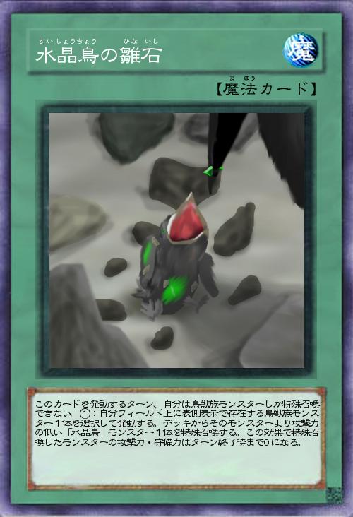 | このカードを発動するターン、自分は鳥獣族モンスターしか特殊召喚できない。①:自分フィールド上に表側表示で存在する鳥獣族モンスター1体を選択して発動する。デッキからそのモンスターより攻撃力の低い「水晶鳥」モンスター1体を特殊召喚する。この効果で特殊召喚したモンスターの攻撃力・守備力はターン終了時まで0になる。 | |||