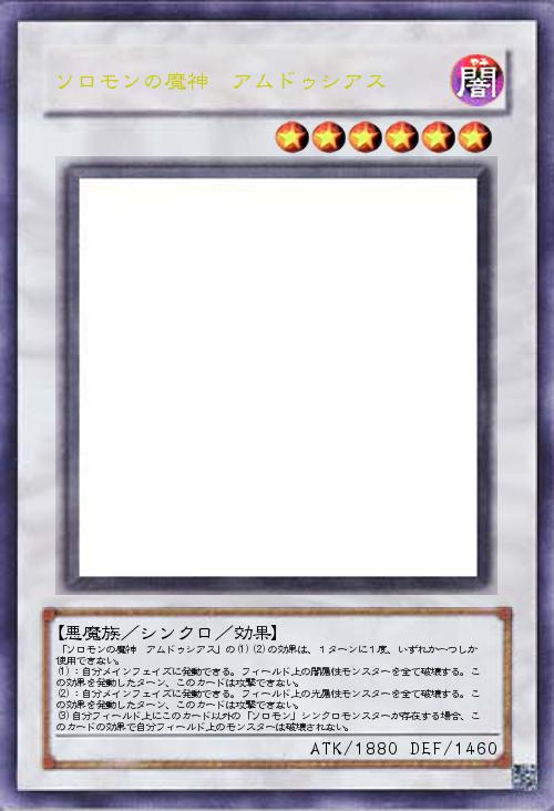| 「ソロモンの魔神 アムドゥシアス」(1)(2)の効果は、1ターンに1度、いずれか一つしか使用できない。 (1):自分メインフェイズに発動できる。このカード以外のフィールド上の闇属性モンスターを全て破壊する。この効果を発動したターン、このカードは攻撃できない。 (2):自分メインフェイズに発動できる。フィールド上の光属性モンスターを全て破壊する。この効果を発動したターン、このカードは攻撃できない。 (3)自分フィールド上にこのカード以外の「ソロモン」シンクロモンスターが存在する場合、このカードの効果で自分フィールド上のモンスターは破壊されない。 | |||