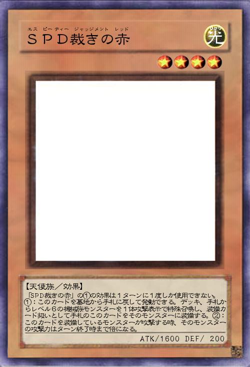 | 「SPD裁きの赤」の①の効果は1ターンに1度しか使用できない。①:このカードを墓地から手札に戻して発動できる。デッキ、手札からレベル6の機械族モンスターを1体攻撃表示で特殊召喚し、装備カード扱いとして手札のこのカードをそのモンスターに装備する。②:このカードを装備しているモンスターが攻撃する時、そのモンスターの攻撃力はターン終了時まで倍になる。 | |||
