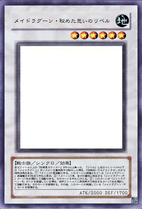 | 自分フィールド上の「好感度カウンター」が4つ以上乗った、「リベル」と名のつくレベル4以下の「メイドラグーン」モンスターを裏側表示で除外した場合、S召喚扱いでエクストラデッキから特殊召喚出来る。①:1ターンに1度発動できる。このカードに装備されている「メイドラグーン」装備魔法を3枚まで手札に戻す。②:1ターンに1度、自分の墓地に存在する「メイドラグーンW」カード1枚を選択して発動できる。そのカードを手札に加える。③:このカードが「メイドラグーン・W」カードを装備している場合、相手フィールドに表側表示で存在するカード1枚を選択して発動できる。そのカードを破壊する。その後、このカードが装備している「メイドラグーン・W」カードを破壊する。 | |||