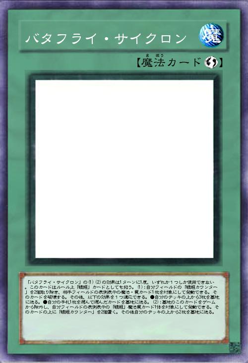 | 「バタフライ・サイクロン」の(1)(2)の効果は1ターンに1度、いずれか1つしか使用できない。このカードはルール上「蝶姫」カードとしても扱う。(1):自分フィールドの「蝶姫カウンター」を2個取り除き、相手フィールドの表側表示の魔法・罠カード1枚を対象にして発動できる。そのカードを破壊する。その後、以下の効果を1つ適応できる。●自分のデッキの上から3枚を墓地に送る。●自分の手札1枚を選んで選んだカードを墓地に送る。(2):墓地のこのカードをゲームから除外し、自分フィールドの表側表示の「蝶姫」魔法罠カード1体を対象にして発動できる。そのカードの上に「蝶姫カウンター」を2個置く。その後自分のデッキの上から2枚を墓地に送る。 | |||
